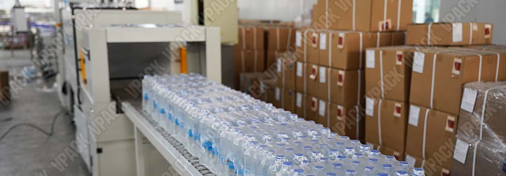Bottles are wrapped in PE shrink film → Heated shrink tunnel forms a tight pack
